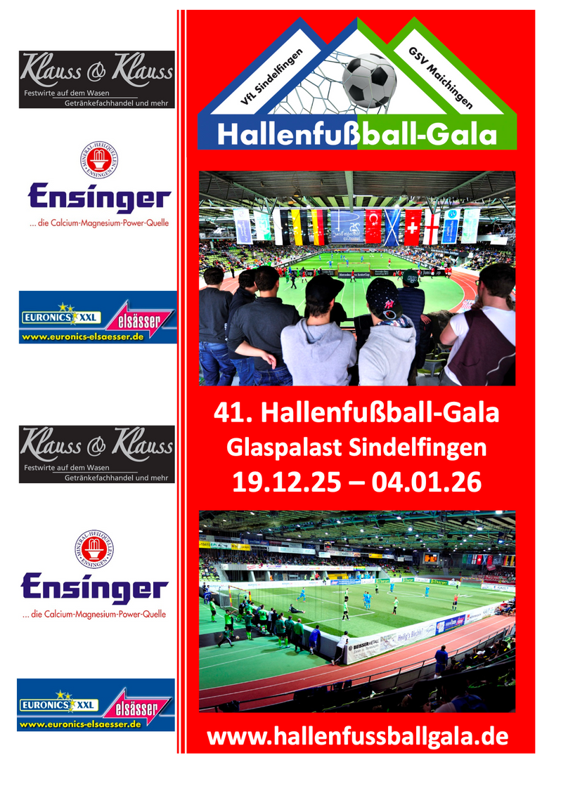 Die Fußballabteilungen des VfL Sindelfingen und des GSV Maichingen veranstalten die 41.Hallenfußball-Gala vom 19.12.2025 bis 04.01.2026 im Glaspalast Sindelfingen.