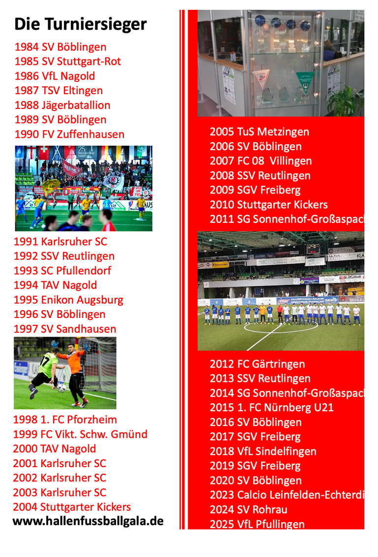 04.01.2026: Oberligist FC Denzlingen gewinnt die 41. Hallenfußball-Gala, im Finale siegt der FC mit 2:1 gegen den FSV Hollenbach. Im kleinen Finale gewinnt die Mannschaft des SSV Reutlingen 1905 mit 7:6 im 10 Meterschießen gegen den SV Fellbach.