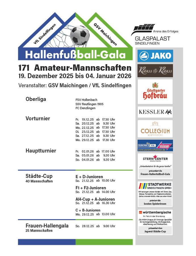 Die Fußballabteilungen des VfL Sindelfingen und des GSV Maichingen veranstalten die 41.Hallenfußball-Gala vom 19.12.2025 bis 04.01.2026 im Glaspalast Sindelfingen.